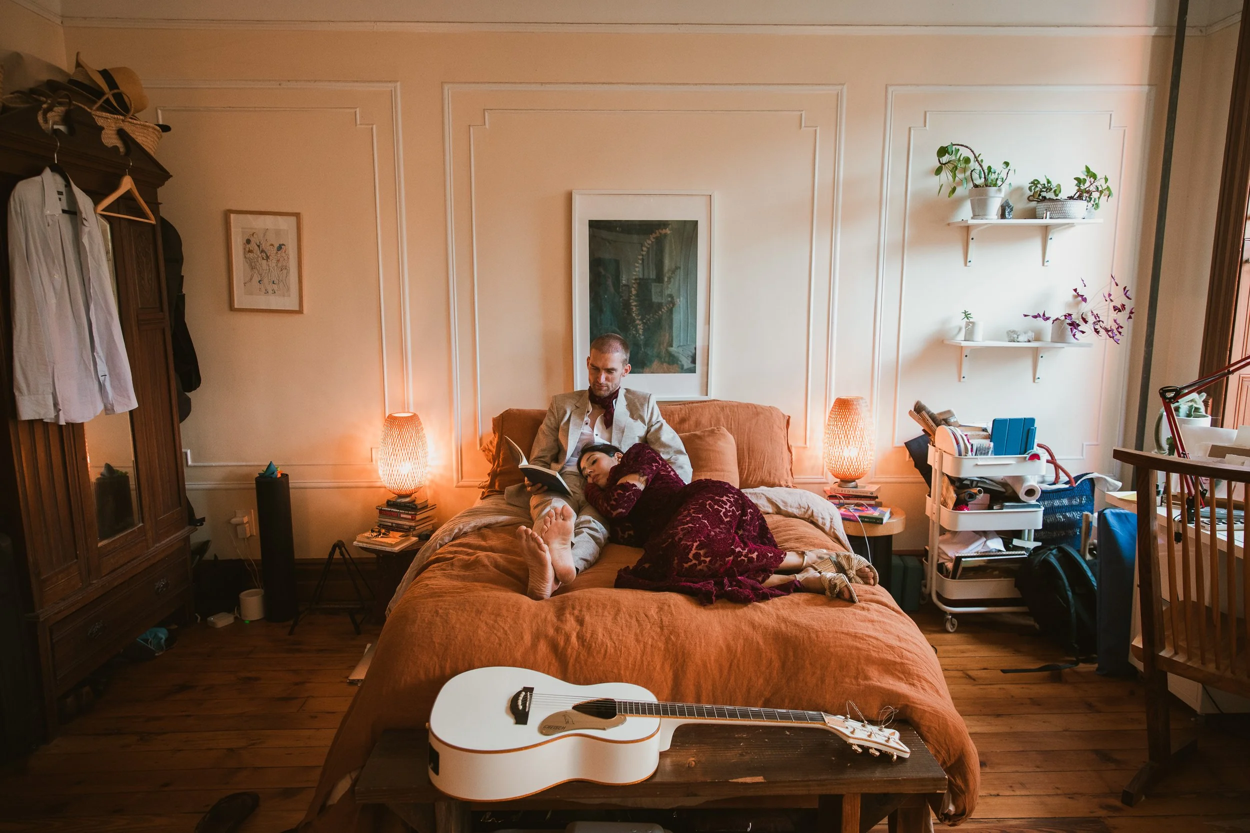 When Jon and Julie (a musician/producer and hairstylist at Kennaland, respectively) reached out for their first anniversary photoshoot, I knew their Bed-Stuy brownstone home would provide a perfect backdrop for celebrating their love story. Having married in the vibrant city of Oaxaca, Jon and Julie’s journey began with a beautiful blend of cultures and music. Their cozy bedroom, adorned with vintage charm and warm tones, set the perfect scene. The natural light flowing through the large windows illuminated their genuine smiles and intimate moments, as they cuddled, read poetry, played music and made art together.